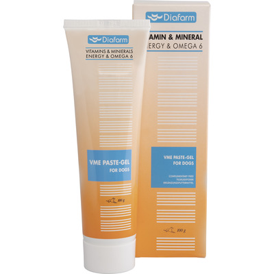 Med et fôrtilskudd fra Diafarm kan du sikre deg at hunden din får et daglig supplement av vitaminer og mineraler. Produktet er nøye sammensatt så det kan brukes til hunder av alle raser og aldre. Tilskuddet medvirker til å holde pelsen til hunden sunn og skinnende samt stimulere appetitten. Derfor er det ekstra godt egnet til hunder med nedsatt appetitt på grunn sykdom eller andre årsaker. Diafarm VME-pasta er i tillegg med til å gi energi til små valper og drektige eller diende tisper.
