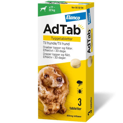AdTab 450 mg tyggetabletter til hund L (11-22 kg) er et reseptfritt legemiddel til behandling av loppe- og flåttinfestasjoner hos hund.