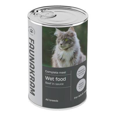 Faunakram våtfôr med biff er et deilig komplett kattefôr med biff i saus