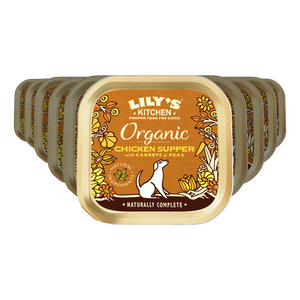 Lily's Kitchen Organic Chicken Supper våtfôr er for hunder fra 4 måneder og kommer i en pakke med 10 x 150 gram