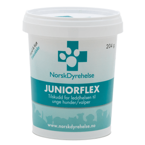 Norsk Dyrehelse JuniorFlex er for deg som ønsker å bidra til normal utvikling av ledd og brusk til din firbeinte venn. Fôrtilskuddet er et frysetørket pulver som inneholder bl.a. grønnleppemusling, som bidrar til bevegeligheten i leddstrukturen, og vitamin C, som støtter immunforsvaret.