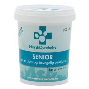 Norsk Dyrehelse Senior er en kombinasjon av flere ulike leddprodukter som Glukosamin, MSM, Grønnleppemusling, Kondroitin og C-vitamin. Senior inneholder også aminosyren L-arginin, som kan øke blodtransporten gjennom kroppen. For den eldre hundens generelle helse og for å bidra til immunsystemets normale funksjon, inneholder Senior også algen Spirulina.