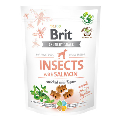 Brit Care Crunchy Cracker Insects med laks er et funksjonelt og velsmakende mellommåltid for sensitiv fordøyelse.