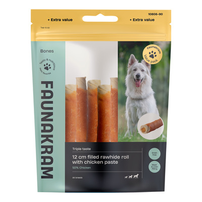 Faunakram 12 cm kyllingfylt hvitt råhudbein er en fylt tyggerull med kyllingkjøttdeig for alle hunder