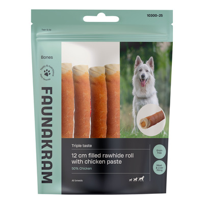 Faunakram 12 cm Filled Rawhide Roll med kyllingfyll er en smakfull tyggerull for alle hunderaser