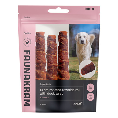 Faunakram 13 cm Roasted Rawhide Roll with Duck Wrap, Liver Filling er en velsmakende tyggerull for små og mellomstore hunder. Den består av stekt råhud med et mykt fyll av andekjøtt og andelever, deretter pakket inn med rent andekjøtt. Produktet inneholder 50 % and og 40 % råhud, noe som gir hunden din både tyggeglede og god smak. Godbiten fungerer som et deilig tilskudd i hverdagen og passer for hunder som liker å tygge lenge.