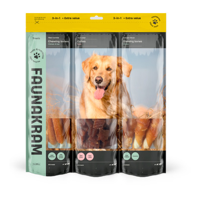 Faunakram hundesnacks 3in1 med and og kylling er en pakke med varierte godbiter for alle hunder