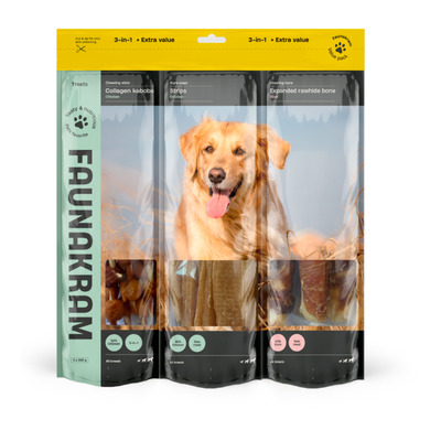 Faunakram hundesnacks 3in1 er en verdipakke som inneholder 3 x 200 g med ulike snacks for hunder. Pakken inneholder råskinnbein med and, myke strimler med 95 % kyllingkjøtt og kollagenkebab med kylling og søtpotet. Disse snacksene er perfekte som belønning under trening eller som et deilig mellommåltid i hverdagen. De ulike formene og teksturene gir variasjon og kan bidra til tannhelse og tyggeglede.