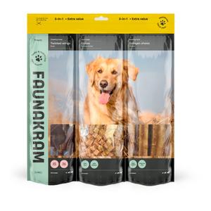 Faunakram hundesnacks 3in1 med kylling, and og torsk kommer med 3 x 200 g hundesnacks med deilige smaker