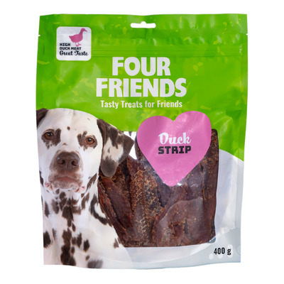 FourFriends Duck Strip er smakfulle strimler laget av 88 % and, noe som gjør dem til en populær belønning blant hunder. Den myke konsistensen og den gode tyggeopplevelsen gjør dem spesielt egnet for mellomstore og store hunder. Stripene kan gis hele eller enkelt deles opp i mindre biter.