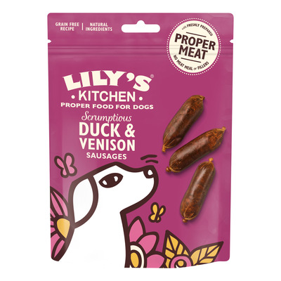 Lily's Kitchen hundesnacks, and- og hjorteviltpølser - en naturlig godbit for hunden din.
