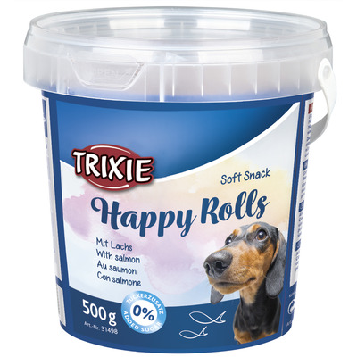 Ønsker du å gi hunden din nye og spennende godbiter, er Happy Rolls fra Trixie et absolutt must i hjemmet! Disse godbitene lages som ruller av passende størrelse. De har en herlig smak av laks som de fleste hunder vil like. Godbitene i Happy Rolls har også en spesiell, myk konsistens, som er grunnen til at de er lettere for hunden din å få i seg.