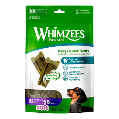 Whimzees Soft Dental Chews XS er 35 % mykere enn Whimzees Stix og Toothbrush, noe som gjør dem lettere å tygge. De er spesielt egnet for følsomme tyggere og eldre hunder som trenger en skånsom løsning for tannrengjøring. Disse tyggetabbene bidrar til å redusere plakk og tannstein og støtter et sunt tannkjøtt.