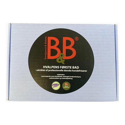 B&B presenterer den blå boksen "Puppy's First Bath", en nøye sammensatt pakke som er designet for å introdusere valpen til sitt første bad på en skånsom og omsorgsfull måte. Denne pakken sikrer en behagelig og trygg badeopplevelse for den nye valpen, med produkter som er skreddersydd for valpens sarte hud og pels.