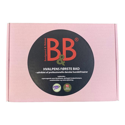 B&B presenterer den rosa boksen "Puppy's First Bath", en nøye sammensatt pakke som er designet for å introdusere valpen til sitt første bad på en skånsom og omsorgsfull måte. Denne pakken sikrer en behagelig og trygg badeopplevelse for den nye valpen, med produkter som er skreddersydd for valpens sarte hud og pels.