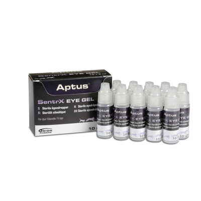 SentrX øye gele fra Aptus er med 0,8% hyaluronsyre og inneholder ikke konserveringsmiddel. Hyaluronsyre inneholder fuktbindende og smørende egenskaper. Øyegeleen er med på å underbygge den naturlige sårheling hos både hunder, katter og hester.