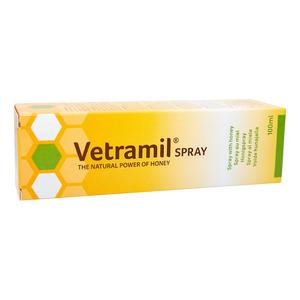 Vetramil Spray er en sårspray til sårbehandling hos dyr. Den er basert på en standardisert medisinsk honning tilsatt eteriske oljer. Sprayen inneholder hydrofile stoffer som skaper et fuktig sårmiljø og en unik antibakteriell effekt som sikrer rask sårtilheling. De eteriske oljene gir en bitter smak som reduserer dyrenes lyst til å slikke på såret.