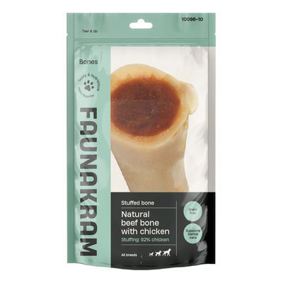Faunakram Natural Beef Bone med 92 % kyllingfyll er en naturlig tyggebelønning for langvarig aktivering