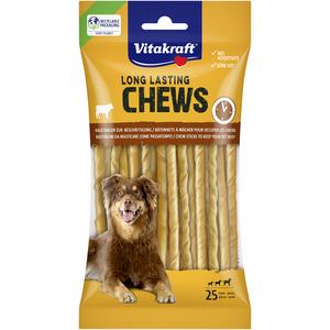 Vitakraft Long Lasting Chews Chew Bars er laget av 100 % tørket okseskinn. Disse vridde tyggestykkene er et flott tillegg til det daglige fôret. Vitakraft Long Lasting Chews er laget uten kunstige smaksforsterkere, fargestoffer og konserveringsmidler, noe som gjør dem til et sunt valg for hunden din.Vitakraft Long Lasting Chews styrker hundens tyggemuskler samtidig som den nyter smaken. Posen inneholder 25 tyggetenner som fremmer sunn tannpleie og gir hunden din en morsom tyggeopplevelse. Passer for alle hunder.