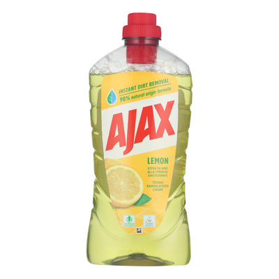 Ajax Lemon Multipurpose Cleaner holder hjemmet ditt rent og skinnende. Dette universalrengjøringsmiddelet har en ny formel som er mer effektiv enn tidligere og skåner selv ømfintlige overflater som marmor og keramikk. Ajax Lemon kommer i en flaske laget av resirkulert plast og har en 95 % biologisk nedbrytbar formel, noe som gjør den mer miljøvennlig.