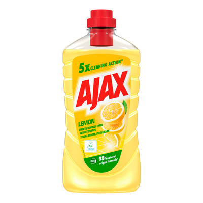 Ajax Lemon Multipurpose Cleaner holder hjemmet ditt rent og skinnende. Dette universalrengjøringsmiddelet har en ny formel som er mer effektiv enn tidligere og skåner selv ømfintlige overflater som marmor og keramikk. Ajax Lemon kommer i en flaske laget av resirkulert plast og har en 95 % biologisk nedbrytbar formel, noe som gjør den mer miljøvennlig.