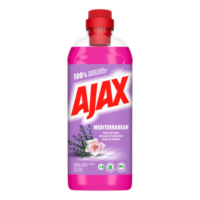 Ajax Mediterranean Lavender er et effektivt universalrengjøringsmiddel som sørger for et rent og friskt hjem. Rengjøringsmidlet fjerner fett og smuss fra hjemmets overflater og etterlater en herlig lavendelduft som skaper en behagelig atmosfære. Flasken er laget av 100 % resirkulert plast, som er resirkulerbar, noe som gjør den til et miljøvennlig valg.