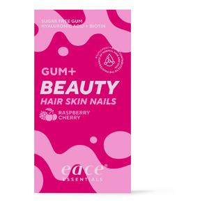 Eace Gum Beauty er tyggegummi med en deilig bringebærsmak og et subtilt hint av kirsebær. Tyggegummiene inneholder hyaluronsyre, biotin, sink og vitamin C, som bidrar til normalt hår, hud og negler. Vitamin C bidrar til normal kollagendannelse, noe som er viktig for normal hud. Biotin og sink bidrar til å opprettholde normal hud, hår og negler. Hyaluronsyre har fuktighetsbevarende egenskaper og kan bidra til å opprettholde hudens elastisitet.