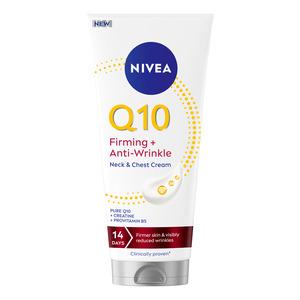 Nivea Q10 Firming Neck & Chest Cream er en spesialutviklet krem for den sarte huden på hals og bryst. Formelen inneholder Q10, kreatin og provitamin B5, som virker sammen for å styrke hudens elastisitet og motvirke synlige tegn på aldring. Den gir intens fuktighet i opptil 72 timer, og huden føles mykere og jevnere.