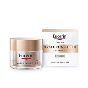 Eucerin Hyaluron-Filler + Elasticity Night er en anti-aldringskrem for natten som styrker hudens elastisitet og reduserer dype rynker. Den inneholder hyaluronsyre som gir fuktighet og fyller ut rynker, samt arctiin og silymarin som stimulerer kollagenfornyelsen og beskytter mot oksidativt stress. Arganolje tilfører nærende lipider som støtter hudens regenerering over natten.