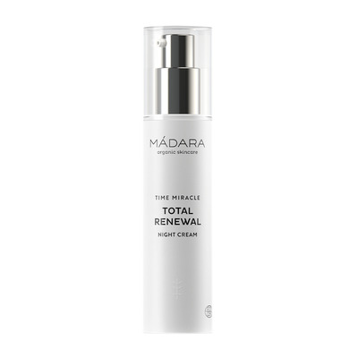 Mádara Total Renewal Night Cream beskytter huden mot frie radikaler og reduserer tegn på tidlig aldring.