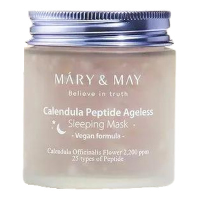 Mary&May Calendula Peptide Ageless Sleeping Mask er en vegansk sovemaske som gir fuktighet og næring til huden mens du sover. Masken er beriket med ringblomstekstrakt, som har betennelsesdempende egenskaper som beroliger irritert hud og reduserer rødhet. I tillegg beskytter antioksidantene i ringblomst huden mot for tidlig aldring. Produktet inneholder 25 typer peptider som stimulerer hudens kollagenproduksjon, noe som bidrar til å redusere fine linjer og gi huden en fastere og mykere tekstur.