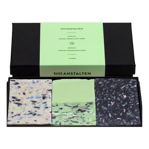 Denne gaveesken fra Badeanstalten inneholder tre av de bestselgende såpene. Såpene har en deilig duft og er basert på vegetabilske oljer og de har et høyt innhold av glycerin som virker fuktighetsgivende.