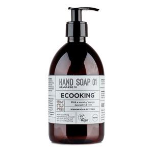 ECOOKING Hand Soap O1 er en supermild og skånsom såpe som renser effektivt uten å tørke ut huden. Den milde formelen er dermatologisk testet, 100 % vegansk og har en diskret, frisk duft av appelsin, lavendel og rose. Såpen kommer også i en fin 500 ml plastflaske med pumpe som du kan gjenbruke til andre væsker.