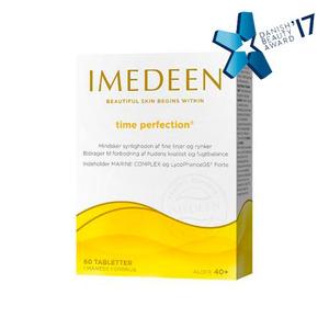 Imedeen Time Perfection er et kosttilskudd utviklet for kvinner over 40 år. Produktet inneholder IMEDEENs ingrediens Marine Complex, samt LycoPhence GS Forte - en kombinasjon av tomatekstrakt, druekjerneekstrakt, sink og C-vitamin. Vitamin C bidrar til normal dannelse av kollagen, som er viktig for normal hudfunksjon, mens sink bidrar til å opprettholde normal hud.