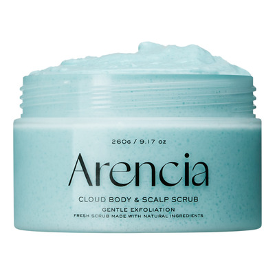 Arencia Fresh Cloud Body & Scalp Scrub er en skånsom kroppsskrubb med fransk havsalt som eksfolierer og renser uten å forstyrre hudens naturlige balanse. Den kan brukes både på kroppen og i hodebunnen, og fjerner døde hudceller og overflødig talg. Skrubbingen har en lett konsistens og en beroligende duft av fransk mynte og lilje som etterlater huden frisk og myk. Spesielt egnet for tørre og ru områder som albuer og knær.