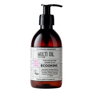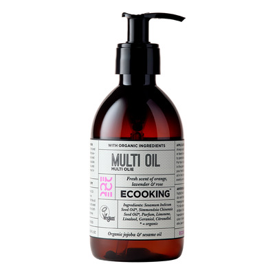 Multi Oil fra Ecooking er et fantastisk multiprodukt som består av en kombinasjon av 100 % økologiske oljer fra sesam og jojoba, samt essensielle duftekstrakter av forfriskende appelsin og beroligende lavendel. Den har en herlig duft, en lett tekstur og uendelige bruksmuligheter. Oljen er fri for parabener og fargestoffer og inneholder kun naturlig duft.