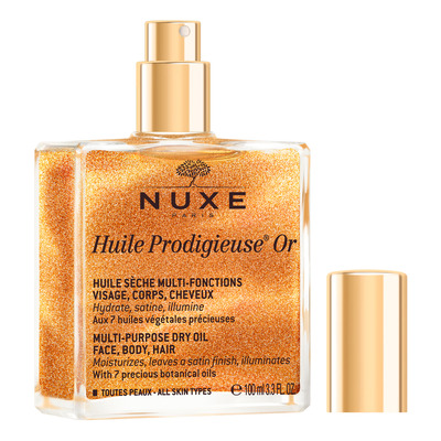 Nuxe Huile Prodigieuse OR er en luksuriøs, multifunksjonell tørrolje med en sammensetning av syv planteoljer, blant annet macadamia-, hasselnøtt- og mandelolje. Den lette formelen trekker raskt inn uten å fete, og etterlater huden silkemyk og glansfull. Denne OR-varianten er tilsatt fine gullpartikler som gir huden en naturlig, strålende glød. Oljen pleier og forskjønner både hud og hår og er egnet for daglig bruk.
