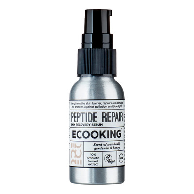 Ecooking Peptide Repair er et reparerende serum med fokus på å styrke hudbarrieren og redusere hudirritasjon. Det er spesielt utviklet for hud som daglig utsettes for UV-stråler, blått lys og forurensning. Den effektive formelen inneholder 10 % lysat av probiotiske bakterier og naturlige Centella-peptider, som støtter hudens naturlige regenereringsprosess og reduserer rødhet, ruhet og urenheter. Serumet er vegansk og dermatologisk testet, og etterlater huden fuktet og beroliget.