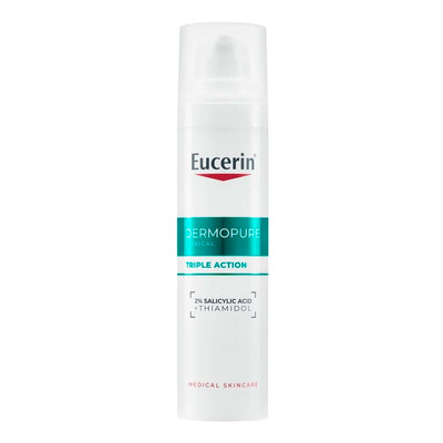 Eucerin DermoPure Clinical Triple Action Serum er en effektiv, lett og oljefri ansiktsbehandling som er utviklet for fet og uren hud. Serumet kombinerer 2 % salisylsyre og det patenterte stoffet tiamidol, som reduserer kviser, hudormer og merker etter akne. Formelen er ikke-komedogen og forstyrrer ikke hudens mikrobiom. Den absorberes raskt og etterlater huden glatt, fuktet og mindre ujevn.