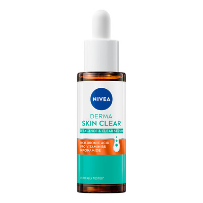 Nivea Derma Skin Clear Serum er utviklet for å berolige og fukte stresset hud og samtidig redusere ujevnheter. Serumet inneholder hyaluronsyre som gir huden intensiv fuktighet, Pro-Vitamin B5 som bidrar til å reparere huden, og niacinamid som reduserer urenheter og synliggjøring av porer. Resultatet er en sunnere hud med bedre spenst og en naturlig glød.