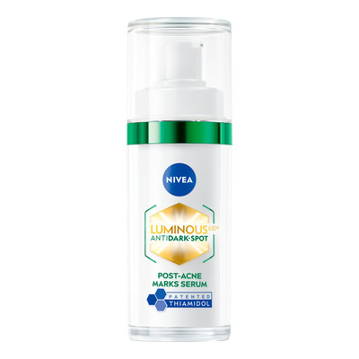 Nivea Luminous630 Post Acne Marks Serum er utviklet for å redusere mørke flekker og ujevn hudtone etter urenheter. Den effektive formelen inneholder patentert Thiamidol®, som bidrar til å jevne ut hudens utseende fra dag én. Serumet er beriket med salisylsyre, som bidrar til å forbedre hudens tekstur og gi en mykere og jevnere overflate.