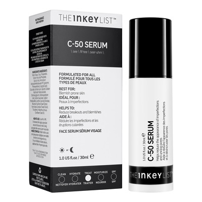 Inkey List C-50 Serum er en nattbehandling med gelkonsistens, utviklet for hud som er utsatt for urenheter. Serumet kombinerer vitamin C og E, som reduserer bakterier og bidrar til å forebygge pigmentering. Salisylsyre eksfolierer skånsomt og fjerner døde hudceller, mens lotusekstrakt balanserer hudens oljeproduksjon og bidrar til et klarere utseende. Serumet er egnet for fet og kombinert hud.