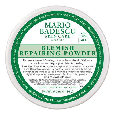 Mario Badescu Blemish Repairing Powder er et lett og beroligende pudder som er utviklet for å absorbere overflødig olje og væske fra åpne urenheter. Pudderet reduserer synlig rødhet og bidrar til å fremme hudens naturlige helingsprosess. Det matterer huden og bidrar til en jevnere hudfarge. Passer for alle hudtyper og er enkel å bruke både i T-sonen og lokalt.