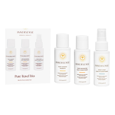 Innersense Pure Travel Trio er et reisesett med tre pleiende produkter som er perfekte for fint og normalt hår. Settet inneholder: Pure Harmony Hairbath, en skånsom og fargesikker sjampo, Pure Inspiration Daily Conditioner, som fukter og lysner håret, og Sweet Spirit Leave In Conditioner, som gir ekstra pleie og gjør håret lettere å style.