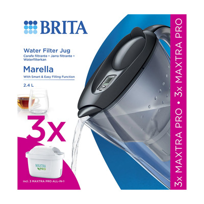 I dette praktiske startersettet får du den superelegante, mørkegrå Marella 2,4 liter vannfilterkanne fra Brita samt 3 stk. Maxtra+ vannfiltre (3 måneders forbruk).