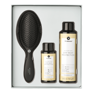 HH Simonsen Dry Heat Protection Gift Box inneholder to størrelser av den effektive varmebeskyttelsessprayen og en skånsom Wonder Brush. Dry Heat Protection beskytter håret mot varme opp til 210 °C og skaper en usynlig barriere som forsegler håret og reduserer krusing. Den hurtigtørkende formelen gir glans og etterlater håret mykt og letthåndterlig. Sprayen passer til alle hårtyper og er perfekt før du bruker rettetang eller krølltang.