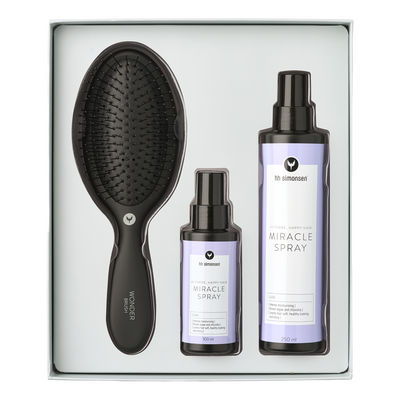 HH Simonsen Wonder & Miracle spray Gift Box er en komplett hårpleiepakke med børste og leave-in spray