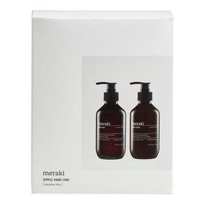 Skjem bort en venn, venninne eller en du er glad i med denne gaveesken fra Meraki. Gaveesken inneholder en Meraki Meadow Bliss håndsåpe og håndlotion, som begge er økologisk sertifisert med ECOCERT Cosmos. De har en frisk duft av sitrus, verbena, tre og te. Håndsåpen er laget med glycerin og økologisk aloe vera som fukter og pleier huden, mens økologisk havreekstrakt virker nærende og beroligende på huden. Den silkemyke håndkremen består bl.a. av økologisk avocadoolje som fukter huden og etterlater den myk og velpleid.