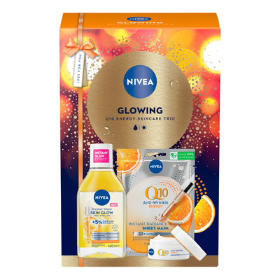 Nivea Glowing Giftpack er en praktisk gaveeske med tre hudpleieprodukter. Pakken inneholder Nivea Micellar Water Skin Glow, en skånsom rens som fjerner sminke og urenheter samtidig som huden etterlates frisk. Den inneholder også Nivea Q10 Anti-Wrinkle Energy Sheet Mask, som gir fuktighet og reduserer forekomsten av fine linjer. Det siste produktet er Nivea Q10 Energy Radiance Boost Day Cream, en dagkrem som gir fuktighet og en friskere hud.