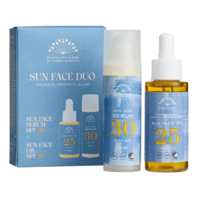 Rudolph Care Sun Face Duo inneholder Sun Face Serum SPF 30 (30 ml) og Sun Face Oil SPF 25 (50 ml) - to ansiktsprodukter som sammen gir bred beskyttelse mot solens UVA- og UVB-stråler kombinert med aktiv hudpleie. Begge produktene er utviklet for å være en del av den daglige hudpleierutinen, og er behagelige å bruke både under sminke og alene.
